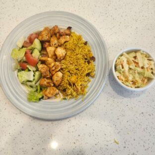 Rice or fries, salad, hummus